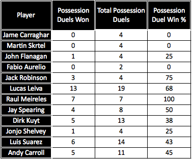 Lucas Leiva, Dirk Kuyt, Luis Suarez, Andy Carroll and Jay Spearing were involved in the most possession duels with Lucas having the highest win percentage of those players. Lucas was involved in nineteen in total which is quite a high number in one game. We were shocked at the number of duels Raul Meireles was in and actually won too as he had a 100% record in this game. He’s not known for his combative skills but it’s another good sign of how he’s fitting into this new Liverpool side and it’s work ethic. Jack Robinson had a 75% win percentage of the possession duels he was involved in so that is a good sign for him.