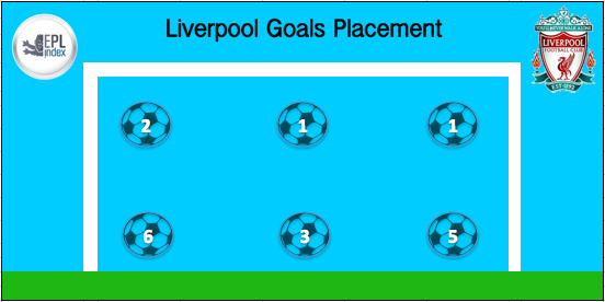 Whilst watching matches I seem to find that Liverpool are shooting directly at the keeper a lot. In fact Liverpool 40% of shots on target have been towards the centre of the goal (25% to left side & 35% to right side – proving this). Shots in the centre of the goal are always going to be the most saved shots (easier for keepers) and the stats prove this. The images created below show the shots on target for Liverpool FC and these include the goals scored too.