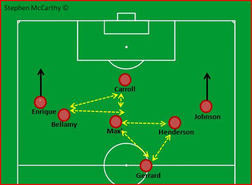 This is a game where we need to re-discover our quickness of play and concentrate on our passing triangles between players. I watched the Bolton game from earlier in the season prior to writing and I was quite surprised at the speed of thought and the quickness of our passes between our attacking players. Compared to recently where we’ve become quite laboured and predictable in our attacking build-up play I was quite surprised at the difference. As you can see from the position of the players on the graphic above, Adam will sit and hold in front of Agger and Skrtel. If Bolton play their 4-5-1 and concentrate on flooding the midfield then Adam will find himself with plenty of time on the ball to start attacks. In this formation I would have Gerrard playing slightly further forward on the right of centre midfield. This allows Gerrard to operate towards Henderson’s right side and with the footballing and passing intelligence of both, it forms a nice triangle with Maxi who sits just in behind Carroll. On the opposite side you have Adam, Bellamy and Maxi also providing nice passing triangles and with Bolton players inevitably getting sucked in it will leave space for Enrique and Johnson to overlap and try to get crosses into the box for Carroll to get on the end of. With so many good passers on the football pitch at once I’d expect a lot of intricate one-two’s and give-and-go’s in front of the Bolton back four. As a consequence if we play this team, I wouldn’t be surprised if we score from a threaded through ball to Bellamy, Gerrard or Henderson who should be making plenty of runs beyond Carroll and Maxi.