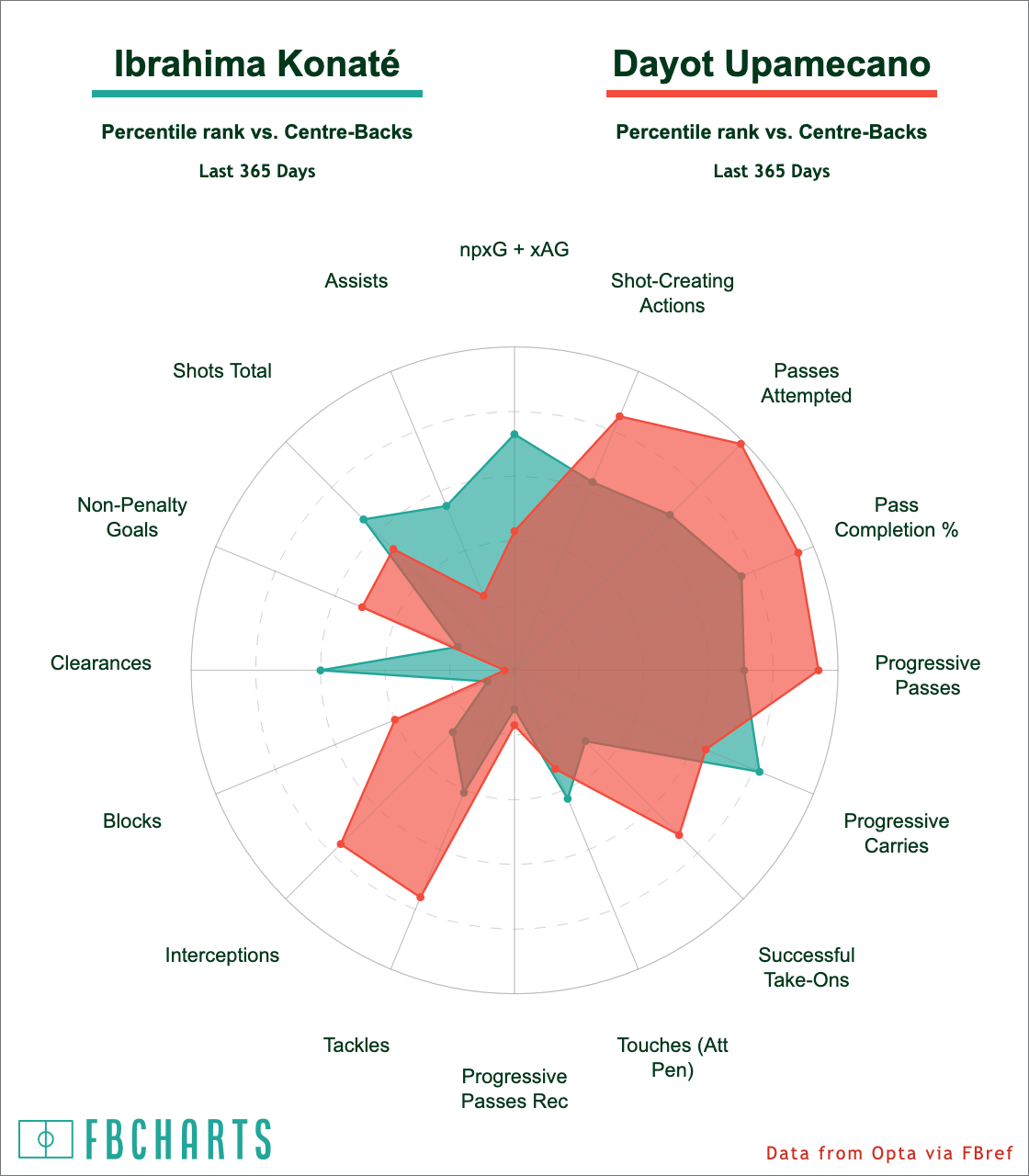 When you compare Ibrahima Konaté and Dayot Upamecano using data from Opta via FBref (visualised by FBCharts), what emerges is a contrast in style rather than quality. Both defenders share a similar footballing education through RB Leipzig’s high-intensity structure, yet their statistical profiles over the last 365 days tell slightly different stories.