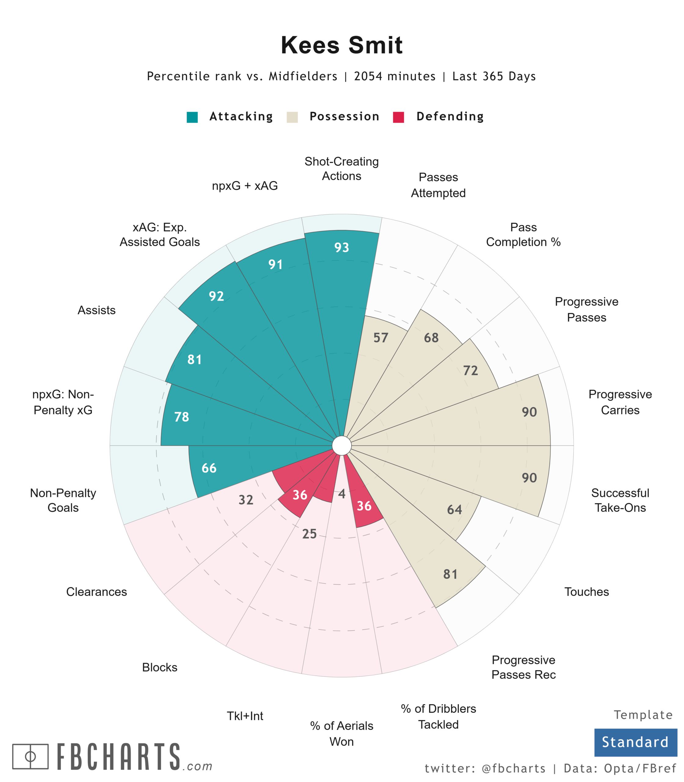 In the final third Smit also shines, averaging 4.12 shot-creating actions per 90 minutes, which places him in the 93rd percentile for midfielders.