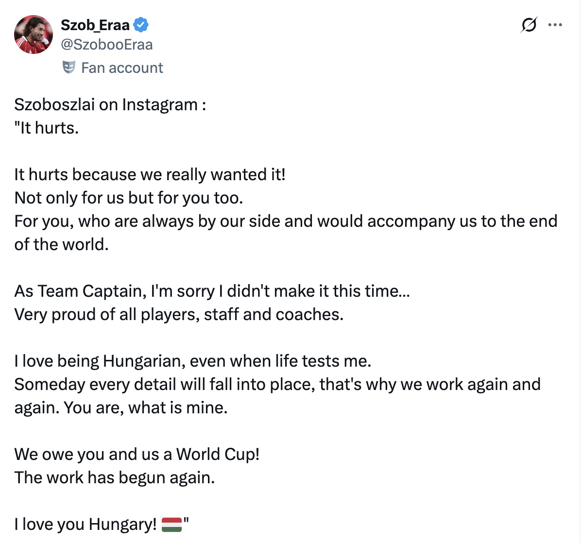 Writing in Hungarian, he admitted the defeat “hurt” deeply, emphasising the shared ambition between the squad and the fans. He apologised as captain but insisted he remained immensely proud of every player and staff member involved in the campaign. His message radiated determination, vowing that Hungary would continue working relentlessly until they earned a place at football’s biggest stage once again.