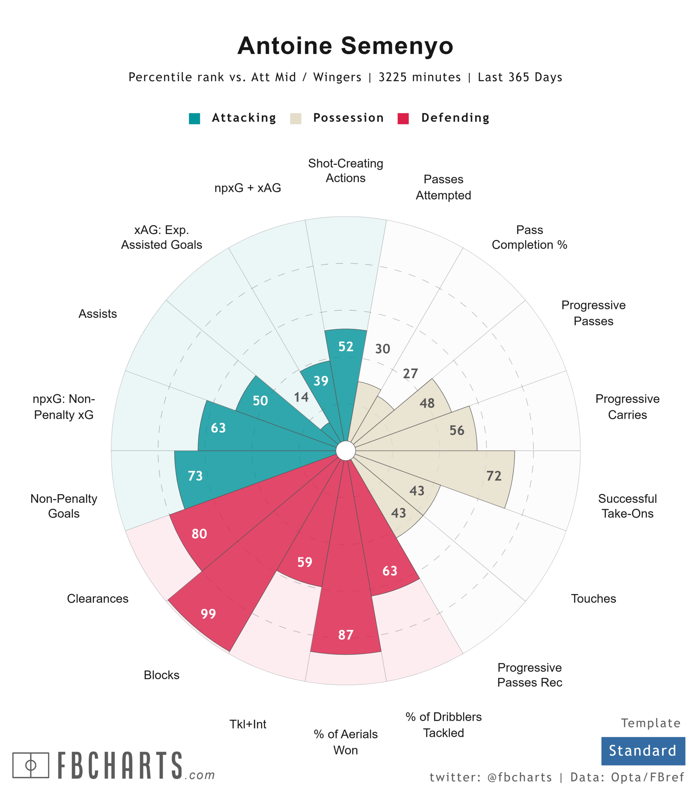 Not only has Semenyo improved his end product, but he has also massively improved his work off the ball. He sits in the 99th percentile for blocks for forwards, averaging 2.03 per 90, as well as averaging 4.47 ball recoveries per 90.