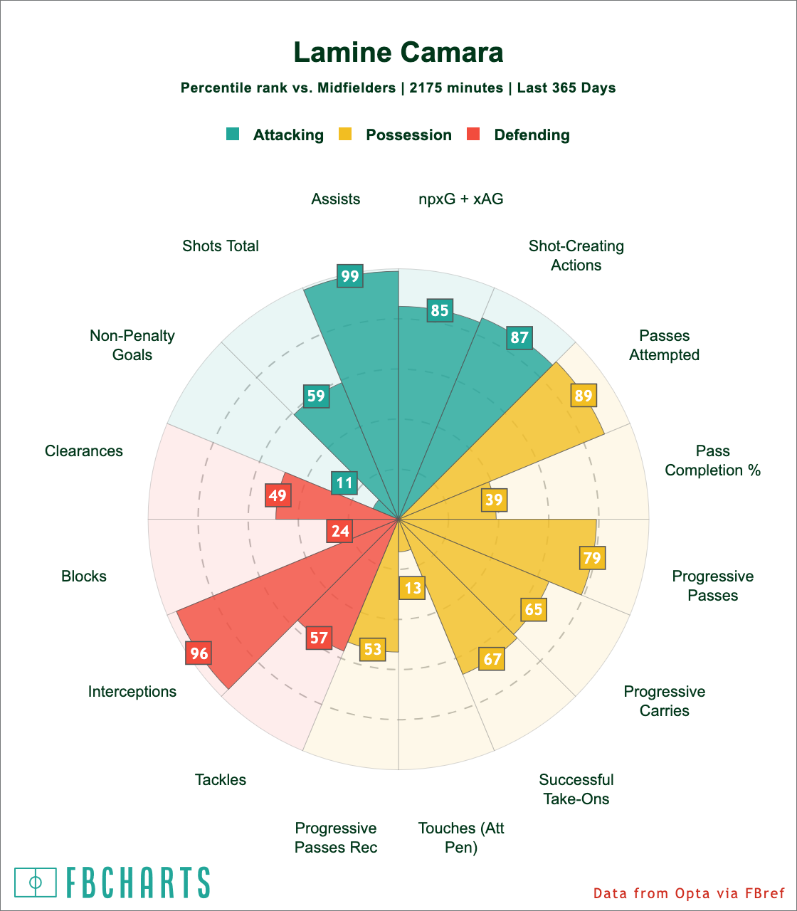 Data analysis has reinforced the eye test. Camara ranks highly for ball recoveries, progressive carries and pass completion under pressure. These metrics are viewed as transferable qualities, particularly for a player stepping into a high-intensity league environment.