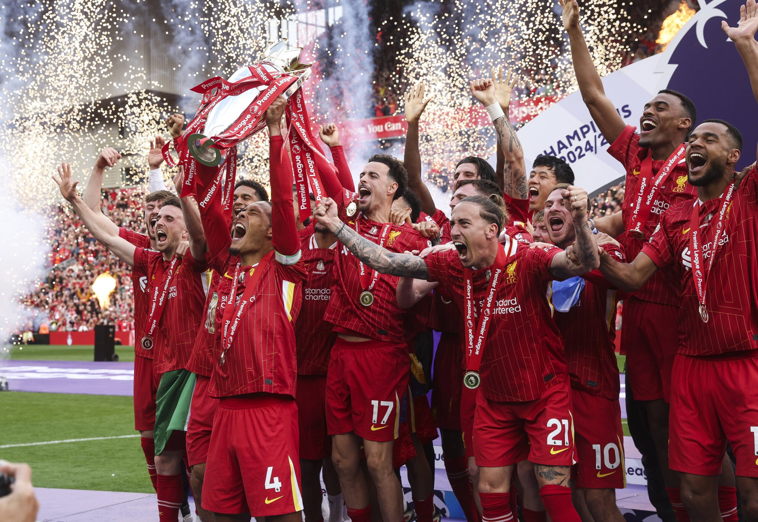 Liverpool Win Premier League Trophy 25.05.2025 Liverpool v Southampton, FA Premier League. Virgil van Dijk of Liverpool lifts the Premier League Trophy PUBLICATIONxINxGERxAUTxSUIxONLY Copyright: xBradleyxOrmesherx NINTCHDBPICT000998119321