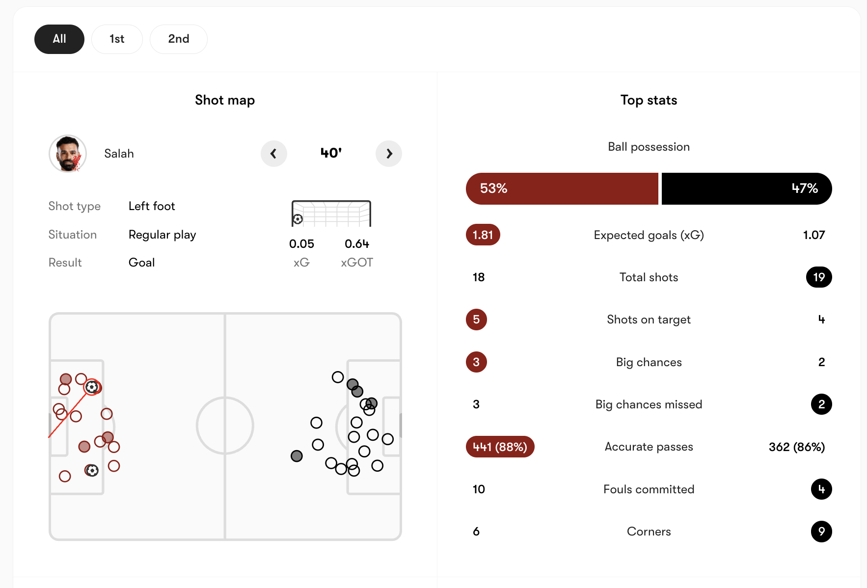 The original source on Futmob shows Liverpool producing an expected goals figure of 1.81, comfortably ahead of Fulham’s 1.07. That gap reflects chance quality rather than sheer volume. Fulham actually registered 19 shots to Liverpool’s 18, underlining their willingness to break forward quickly and test defensive organisation. However, Liverpool’s shot profile was cleaner, more deliberate, and ultimately more dangerous.