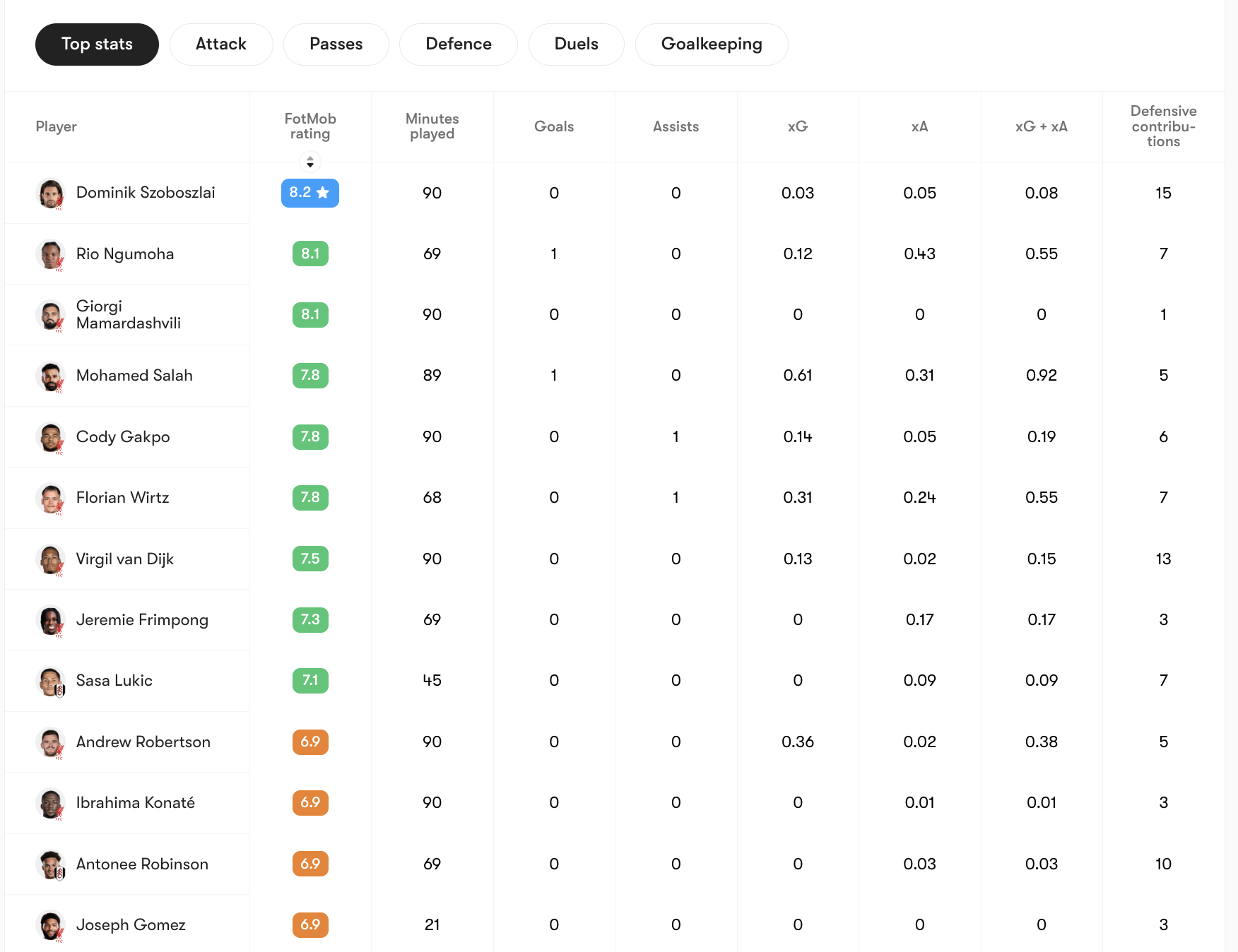 Elsewhere, Dominik Szoboszlai posted the highest match rating at 8.2, reflecting his influence across phases. His 15 defensive contributions highlight a blend of creative and destructive qualities, offering Liverpool control in midfield transitions.