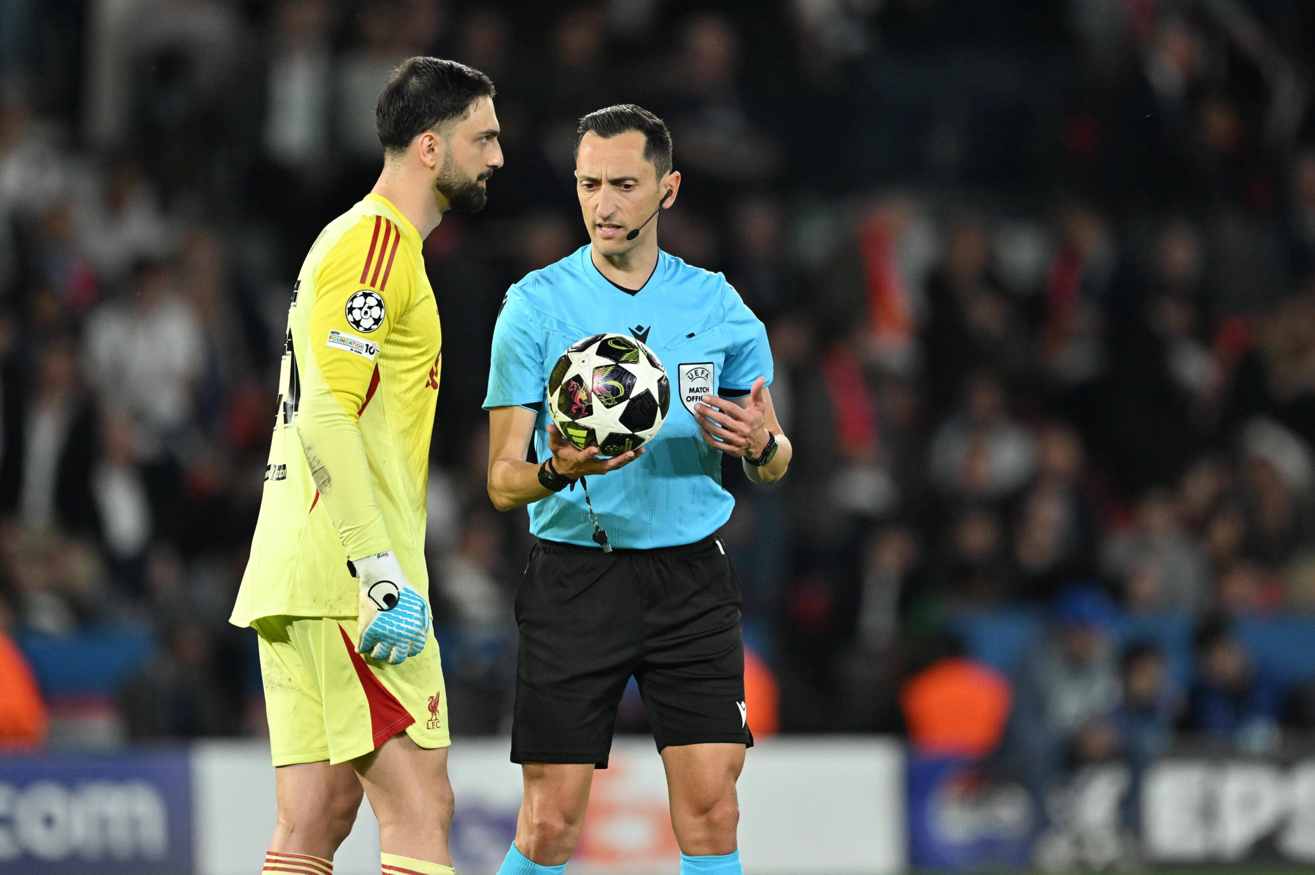 PSG v Liverpool – UEFA Champions League Quarter-finals PARIS, FRANCE – APRIL 8: Referee talks with Giorgi Mamardashvili